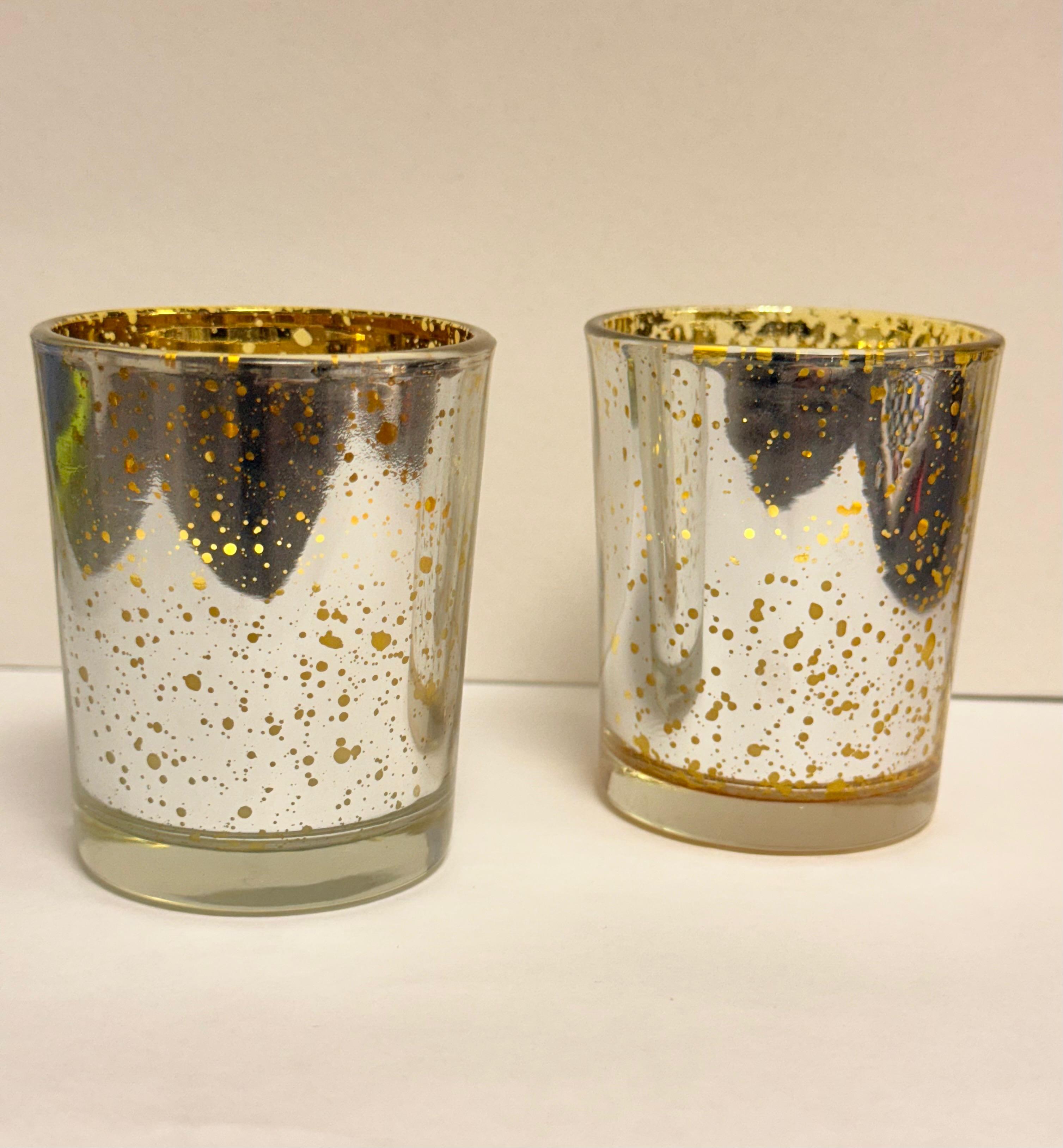 This Unique Votive has Speckled Silver Glass on the Outside and is Speckled Gold on the inside it includes a Candle for a 12hr Burn Time.