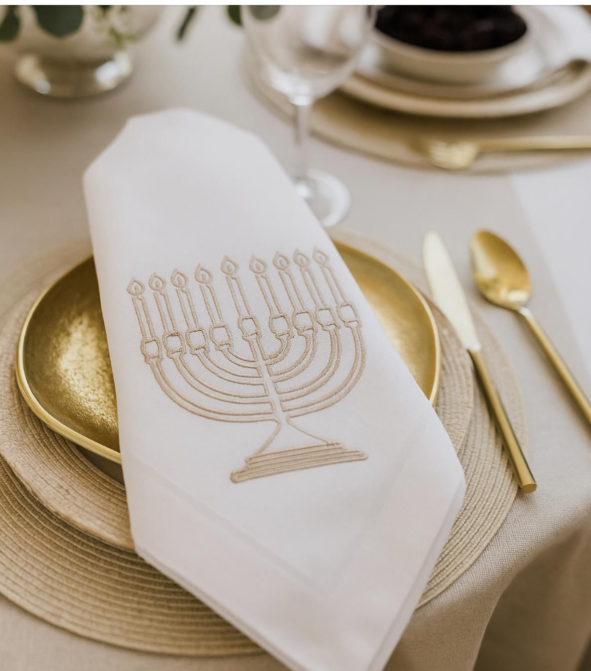 Celebrate Chanukah in style with this hand-stitched cloth napkin, adorned with a luminous gold menorah. Designed to honor the Festival of Lights, this thoughtful piece brings warmth and tradition to your holiday table. The intricate embroidery transforms an everyday essential into a meaningful keepsake that guests will admire. Perfect for Chanukah dinners, it's a beautiful way to infuse your celebration with elegance and spiritual significance.