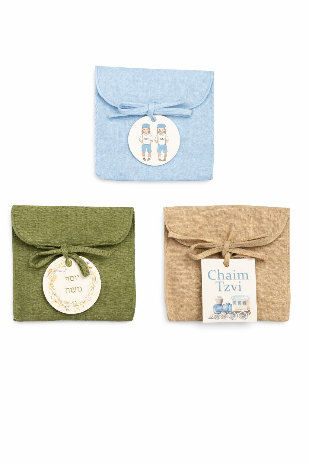 Perfect for milestone celebrations, this 5.5" x 5" cotton pouch makes an elegant party favor for upsherin, sheva brochos, and special occasions. Choose from four sophisticated colors and personalize with a custom logo or name to create a memorable keepsake your guests will treasure. The charming bow detail adds a festive finishing touch to every gift.