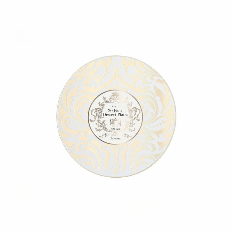 The Baroque Collection brings refined style to your table. Choose from a 10.25" dinner plate or 7.5" salad and dessert plates, each crafted from durable plastic. The dinner and salad plates feature an elegant gold swirl pattern on a clear plate. Available in packs of 20, these plates work beautifully for your next upscale event.
