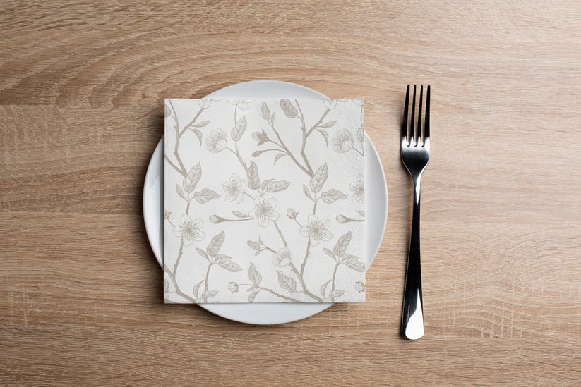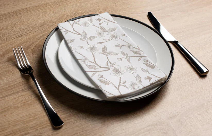 Soft taupe tones and delicate florals come together in a modern tablescape designed for effortless, elevated entertaining.