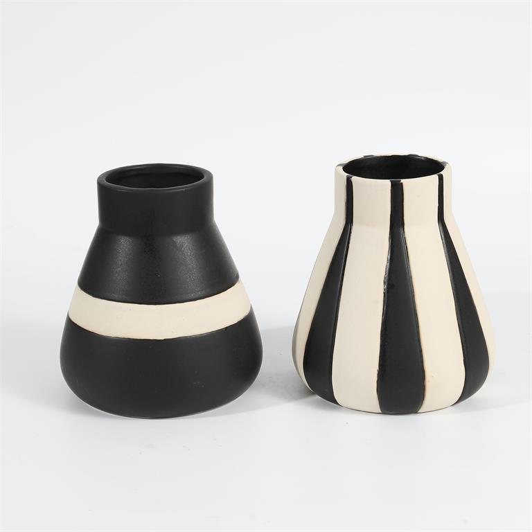 This ceramic vase combines sleek black and natural tones for a modern, refined look. Its minimalist design enhances any space with understated elegance, making it a perfect accent for contemporary interiors.