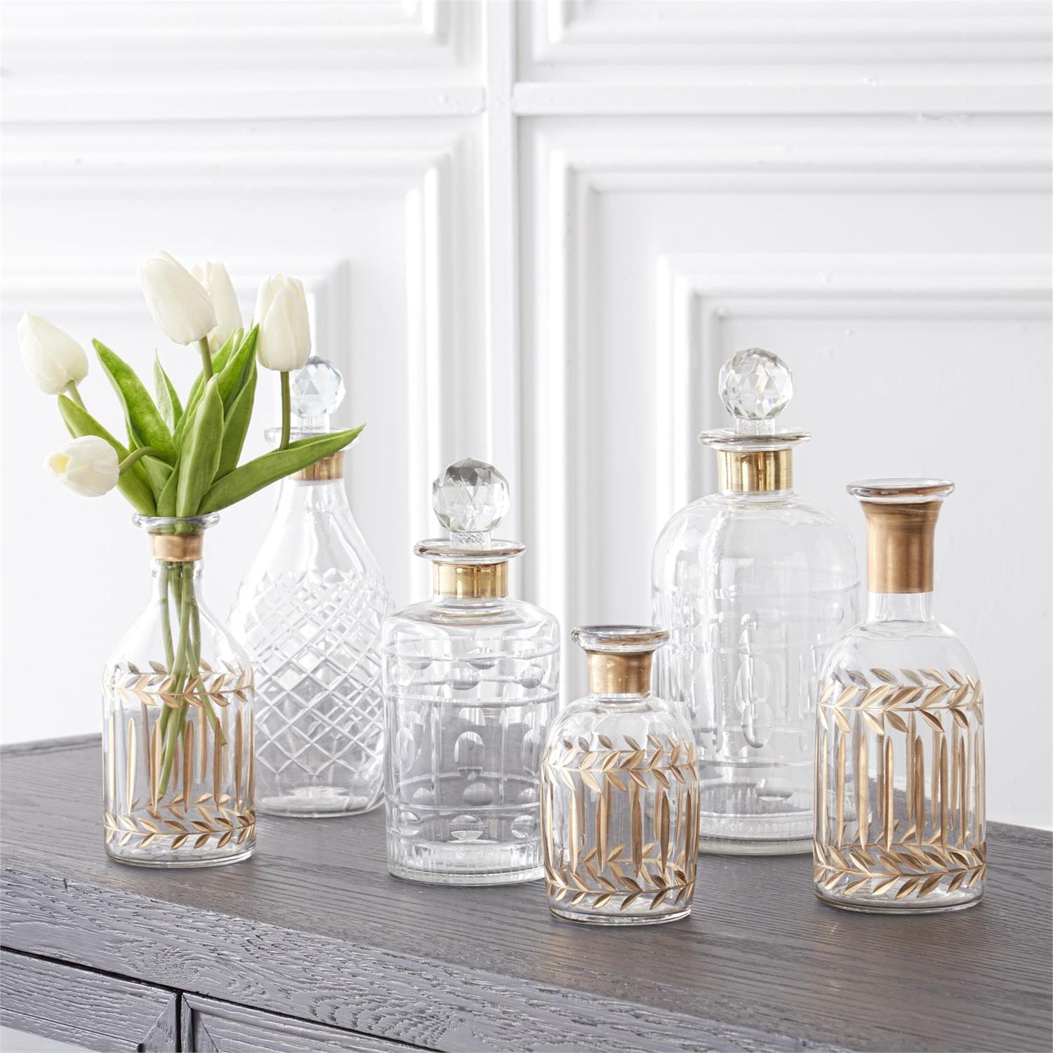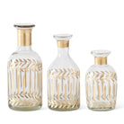 This elegant set of three clear glass vases features delicate gold-gilded leaf etching, each in a different size to create a harmonious display. Their understated design brings a serene, refined touch to any space, perfect for showcasing fresh blooms or standing alone as artful accents.
