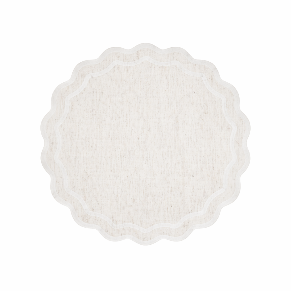 Elevate your table setting with this elegant cloth placemat featuring a distinctive double scalloped border in natural tones. Crafted for everyday elegance and special occasions alike, each placemat protects your table while adding a refined touch to your dining experience. The soft, durable fabric resists stains and washes easily for convenient care. Set of four placemats offers versatility for family dinners or entertaining guests. A timeless accent that complements any tableware collection.