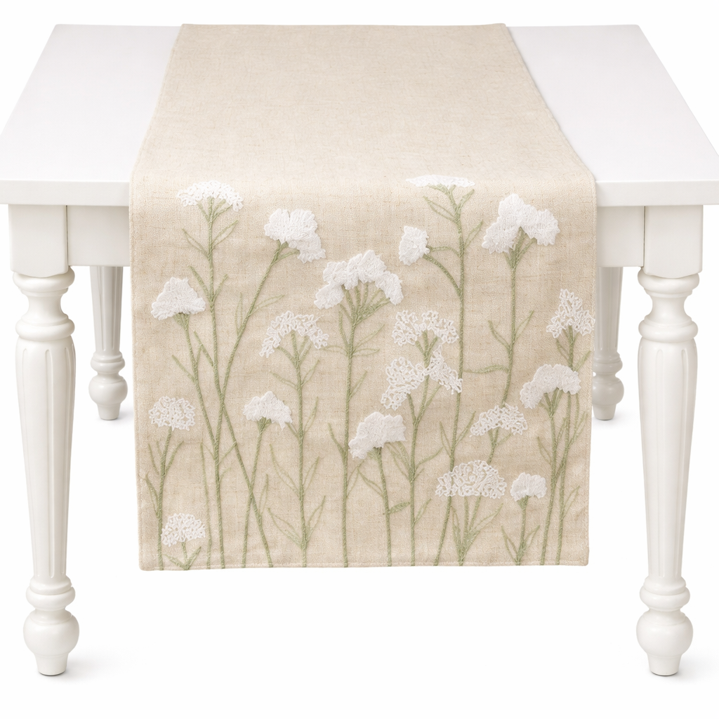 Elevate your table with this elegant cloth runner featuring delicate embroidered flowers. Perfect for adding a touch of sophistication to dining occasions, this piece combines timeless floral artistry with premium fabric quality. The intricate embroidery details create visual interest while maintaining a refined, understated aesthetic. Ideal for everyday elegance or special gatherings, this runner complements any table setting and brings a curated, luxe feel to your home.