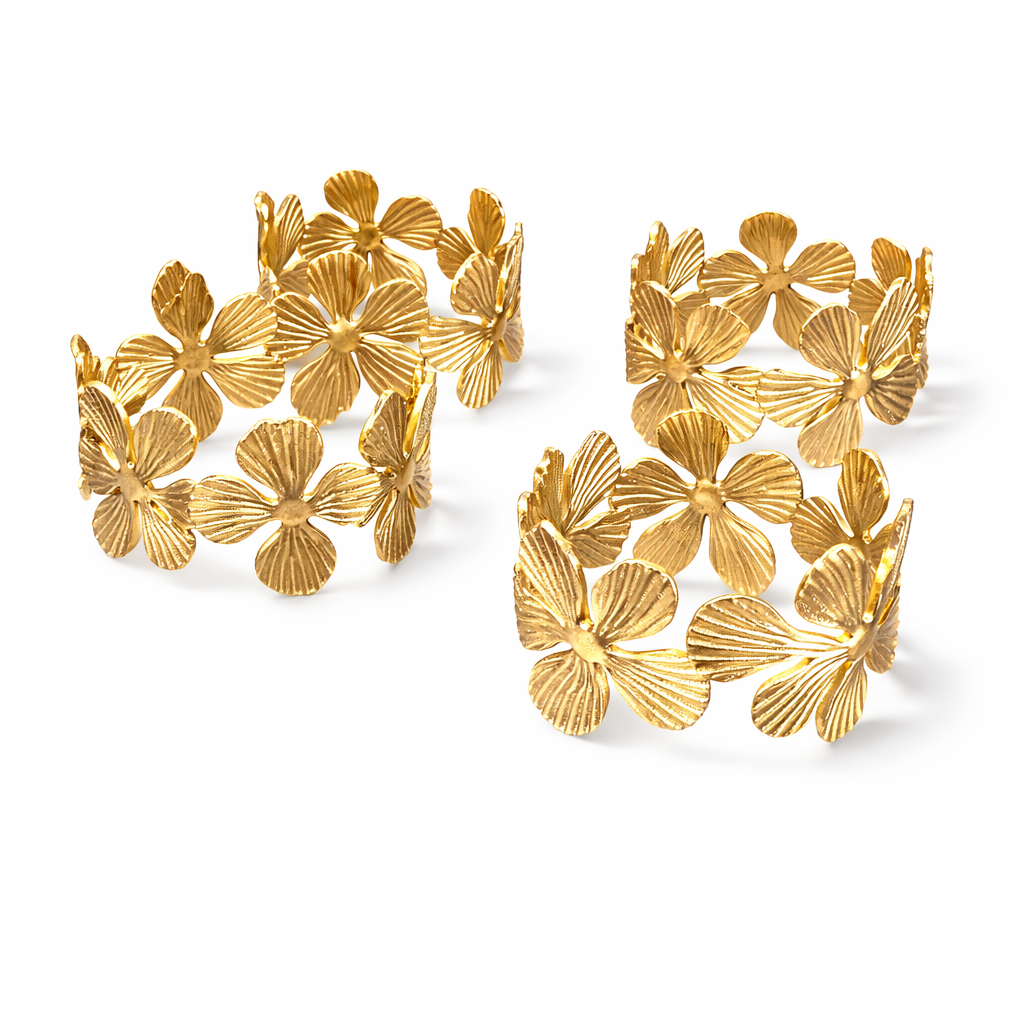 Elevate your table setting with these sculptural cuff flower napkin rings, designed to add an organic, refined touch to any occasion. Each pack includes four rings, perfect for intimate dinners or larger gatherings. Crafted with attention to detail, they complement both modern and classic table aesthetics while keeping napkins elegantly secured throughout the meal.