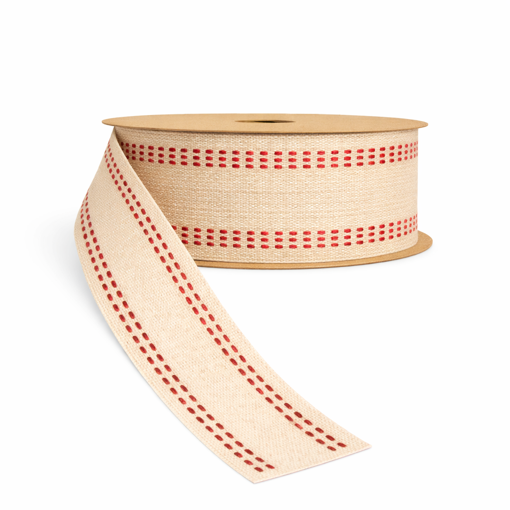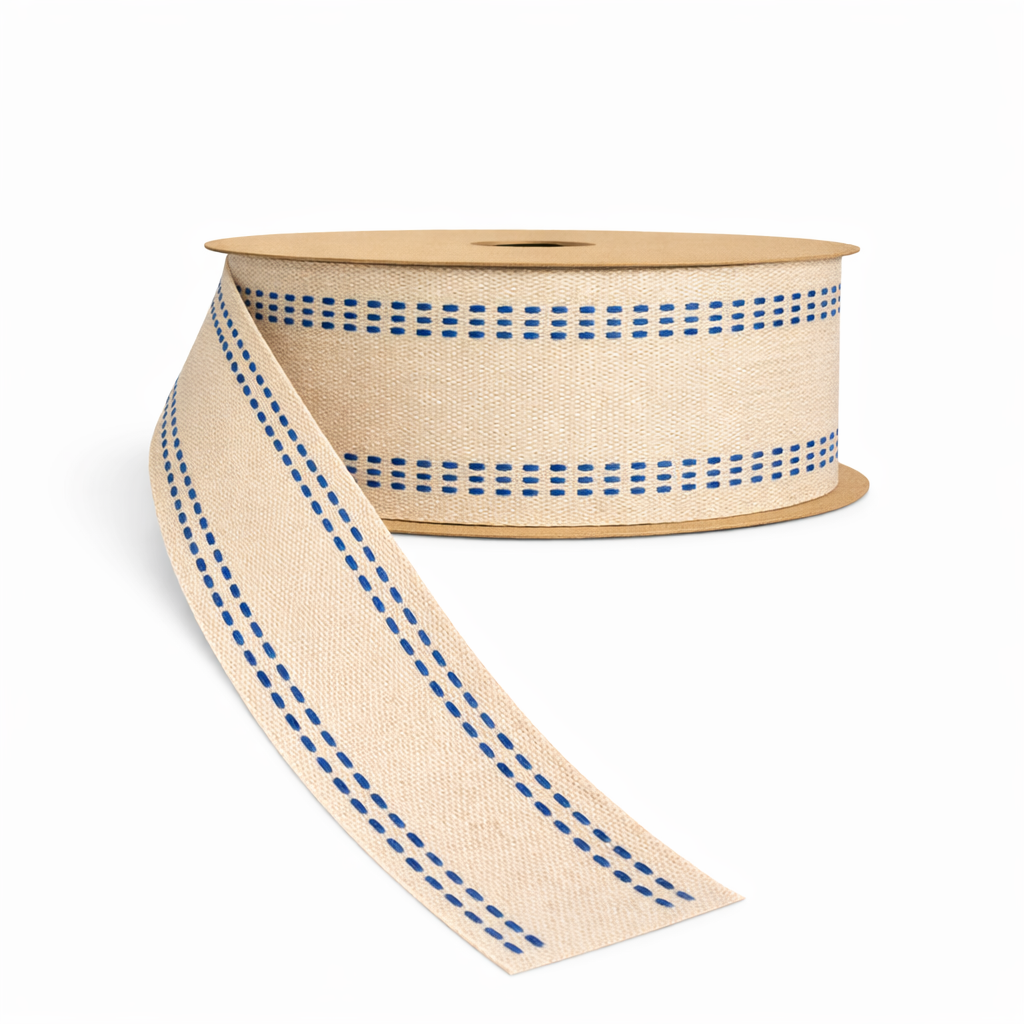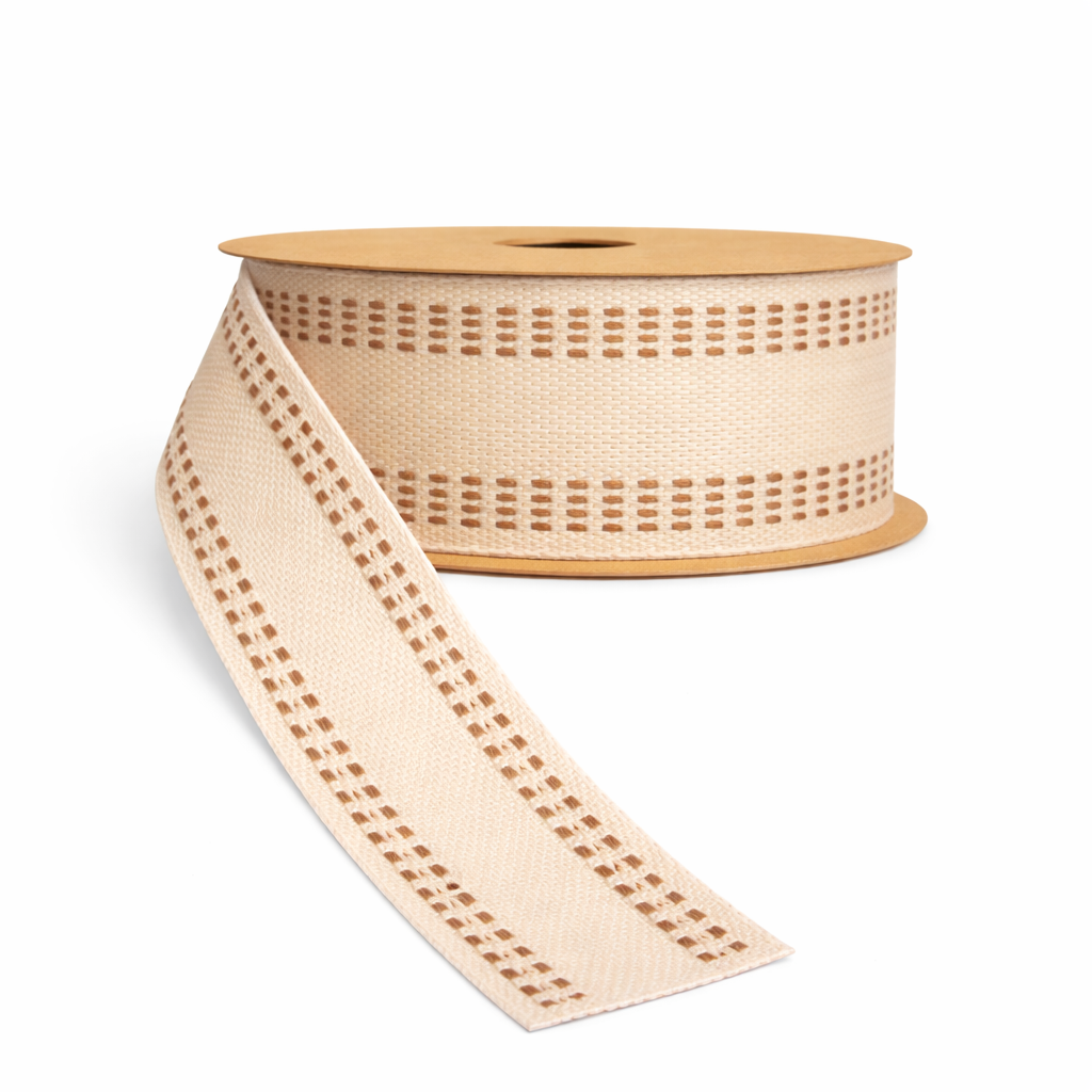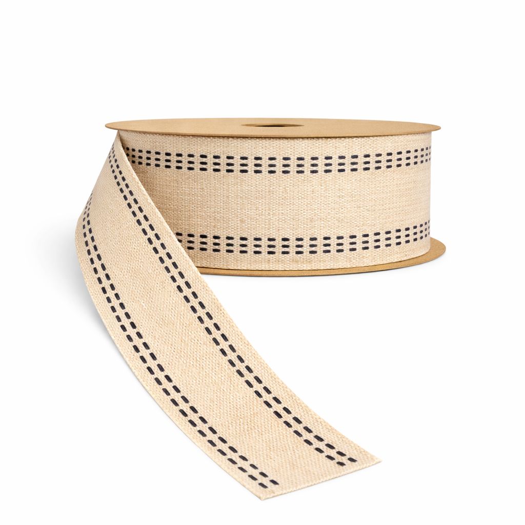Rustic faux burlap ribbon with decorative stitching detail. Perfect for gift wrapping, event styling, and table décor. Adds warmth and texture to any tabletop presentation or floral arrangement. Versatile accent for premium entertaining.